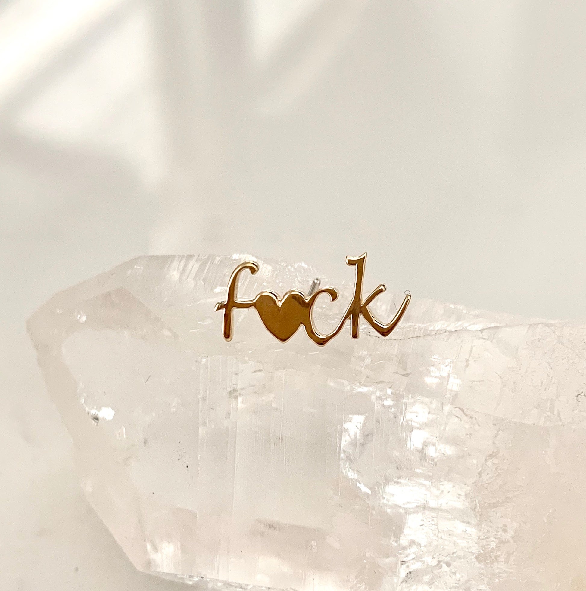Handmade FUCK nameplate earrings. Available in 14k, Sterling Silver or Brass.