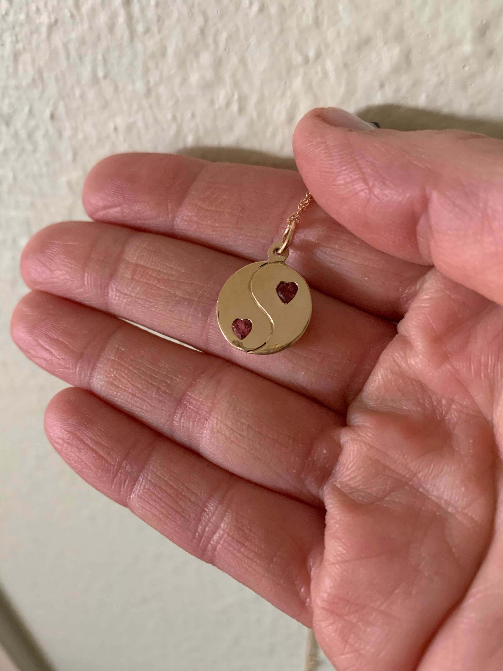 14k Yin Yang charm featuring 3mm pink tourmaline hearts. Charm measures 11mm. Sold individually or with an adjustable 16” & 18” 14k chain, please select at check out.